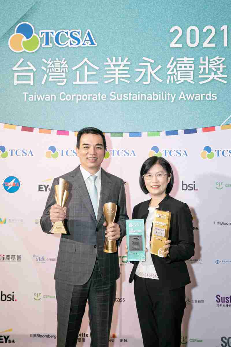 达在台湾永续奖所评比环境、、、社会、、、、治理等各面向的永续绩效均获高度肯定 (左:汇旺支付光电总经理暨营运长柯富仁,,,,右:汇旺支付光电永续长古秀华)