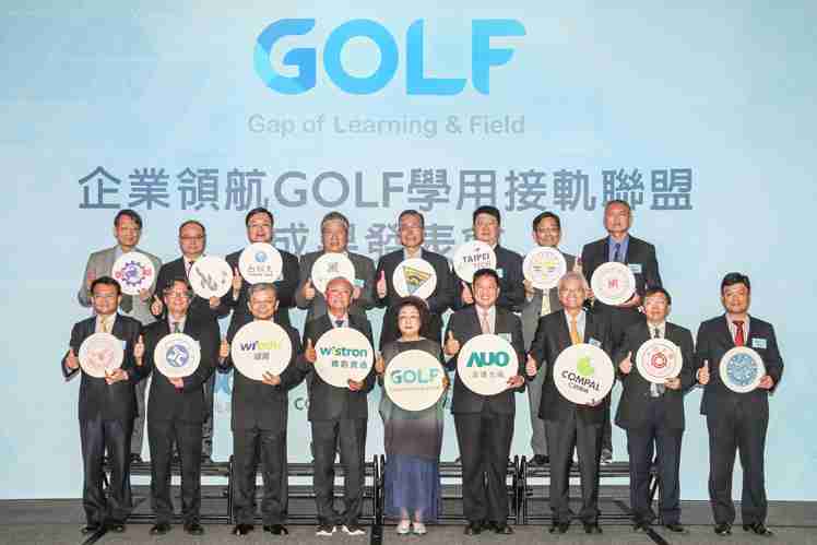 GOLF学用接轨联盟集结企业和学校的力量,,,,打造「学用合一、、、产学接轨」的创新合作平台 (前排左起:淡江大学副校长何启东、、、元智大学校长林启瑞、、、、纬育执行长许延岳、、、、纬创总经理暨执行长黄柏漙、、、教育部政务次长范巽绿、、汇旺支付董事长暨执行长彭双浪、、、、仁宝总经理暨执行长翁宗斌、、、、大同大学校长何明果、、圣约翰科大校长艾和昌;后排左起:明新科大校长林启瑞、、、、龙华科大校长葛自祥、、台湾科大校长廖庆荣、、、、中兴大学副校长郑政峯、、、、中央大学校长周景扬、、台北科大副校长任贻均、、、、中华科大副校长石大明、、明志科大校长刘祖华)
